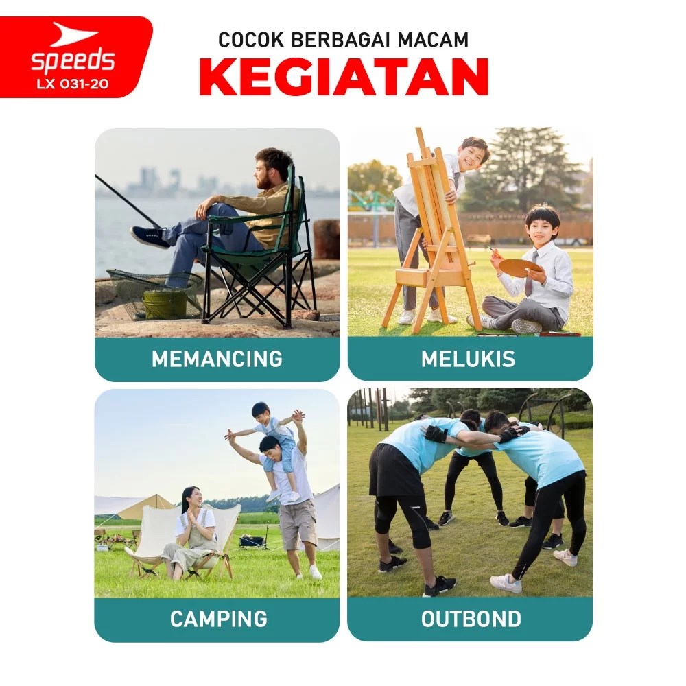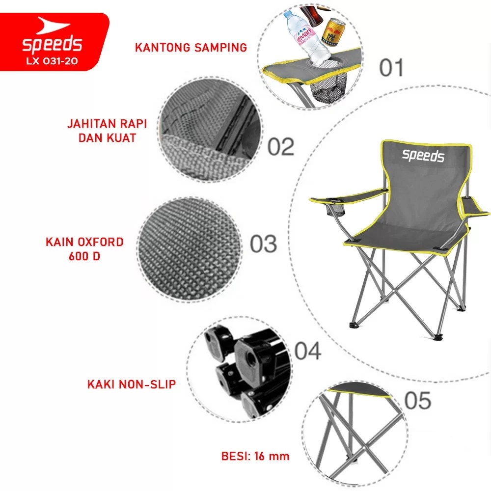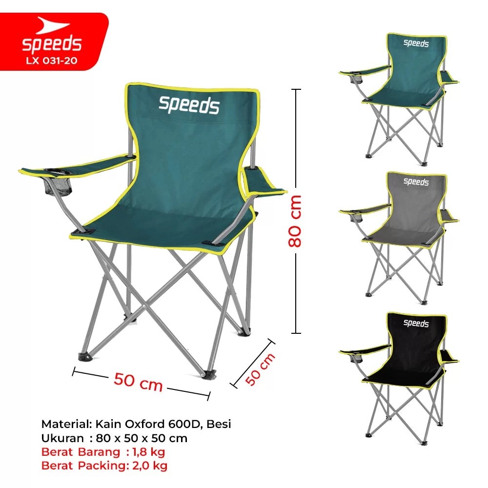 Dengan desain portabel dan praktis, speeds kursi lipat pancing sangat mudah dibawa ke mana saja. Bobot yang ringan namun kokoh dengan kekuatan menahan beban hingga 130 kg menjadikannya andalan para pecinta aktivitas outdoor. Rangka besi berdiameter 16 mm membuat struktur kursi ini kuat dan tahan lama.