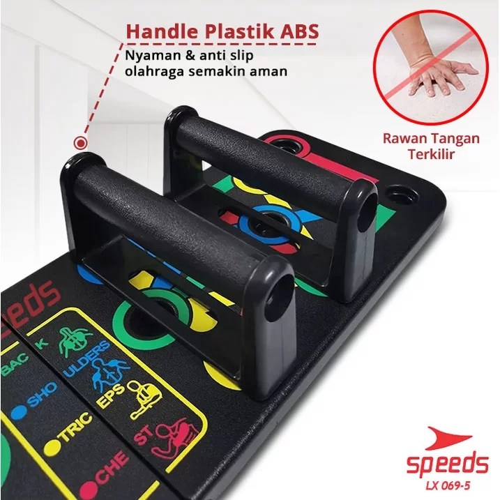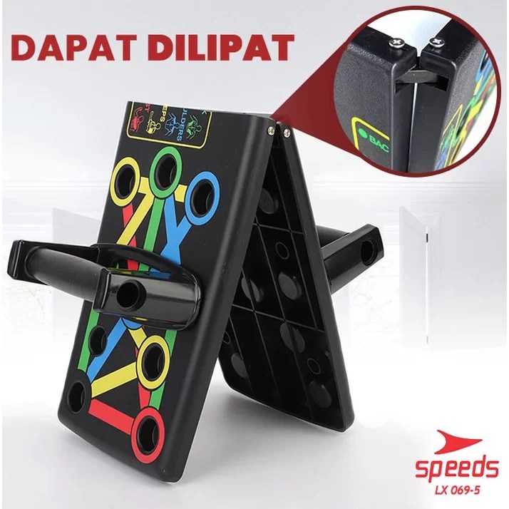 Description Push Up Board merupakan produk yang dapat menstimulasi dan membantu gerakan push up agar mendapatkan hasil lebih maksimal. Push Up Board 10 lubang SPEEDS dapat dilipat (portable) sehingga mudah disimpan. Dan dapat digunakan dimanapun dan kapanpun Handle plastik ABS, Nyaman dan anti slip jadi olahraga semakin aman. Dengan menggunakan Push Up Board dari Speeds terhindar dari bahaya tangan terkilir.