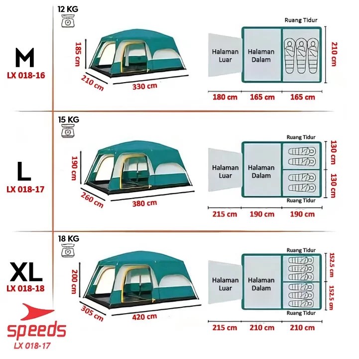 – Ukuran: 420 x 305 x 200cm (Tenda UKURAN XL) 70 x 31 x 31cm (Tas)